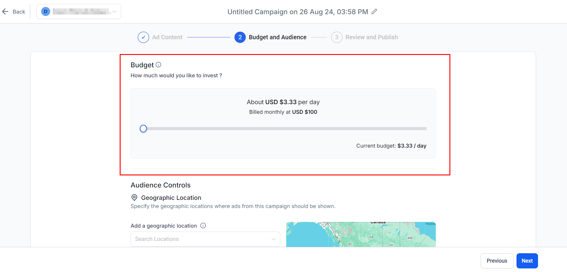 Monthly Budget: Set a monthly budget for your campaign, functioning as a subscription. The budget is divided daily, with average views displayed. You can adjust the budget as needed by renewing the subscription.