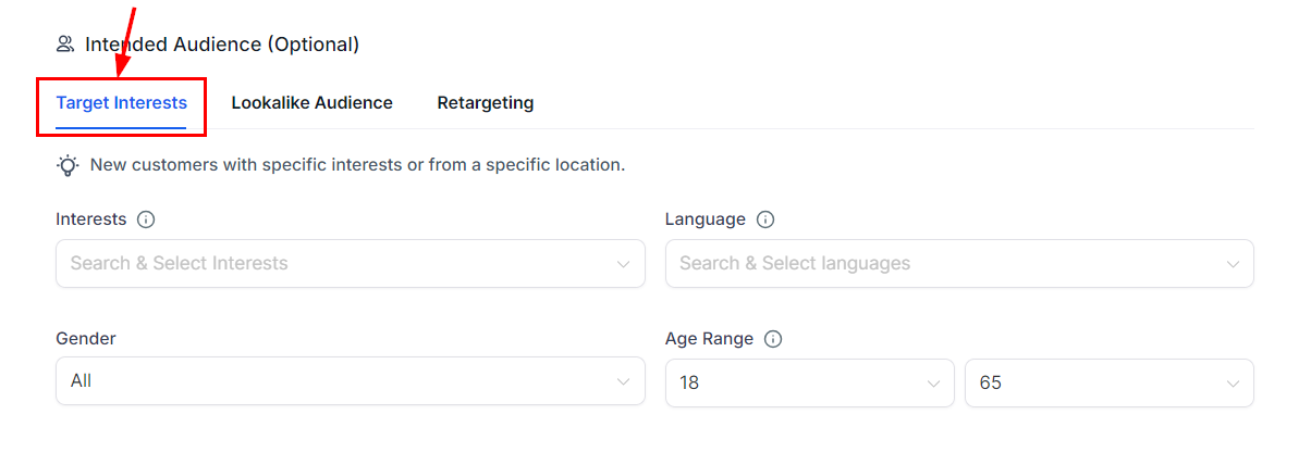 Optional Settings: Further refine your campaign with specific options for interest, gender, language, and age group within the Target Interests section.