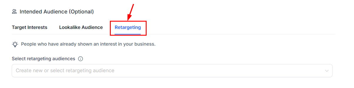 Additionally, select up to 15 retargeting audiences from the Retargeting dropdown to be used in a campaign as the target audience.
