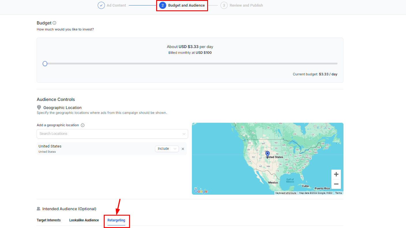 During the campaign creation process, in the Budget and Audience step, locate the Retargeting tab within the Audience Controls section.