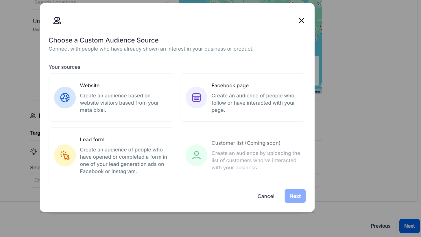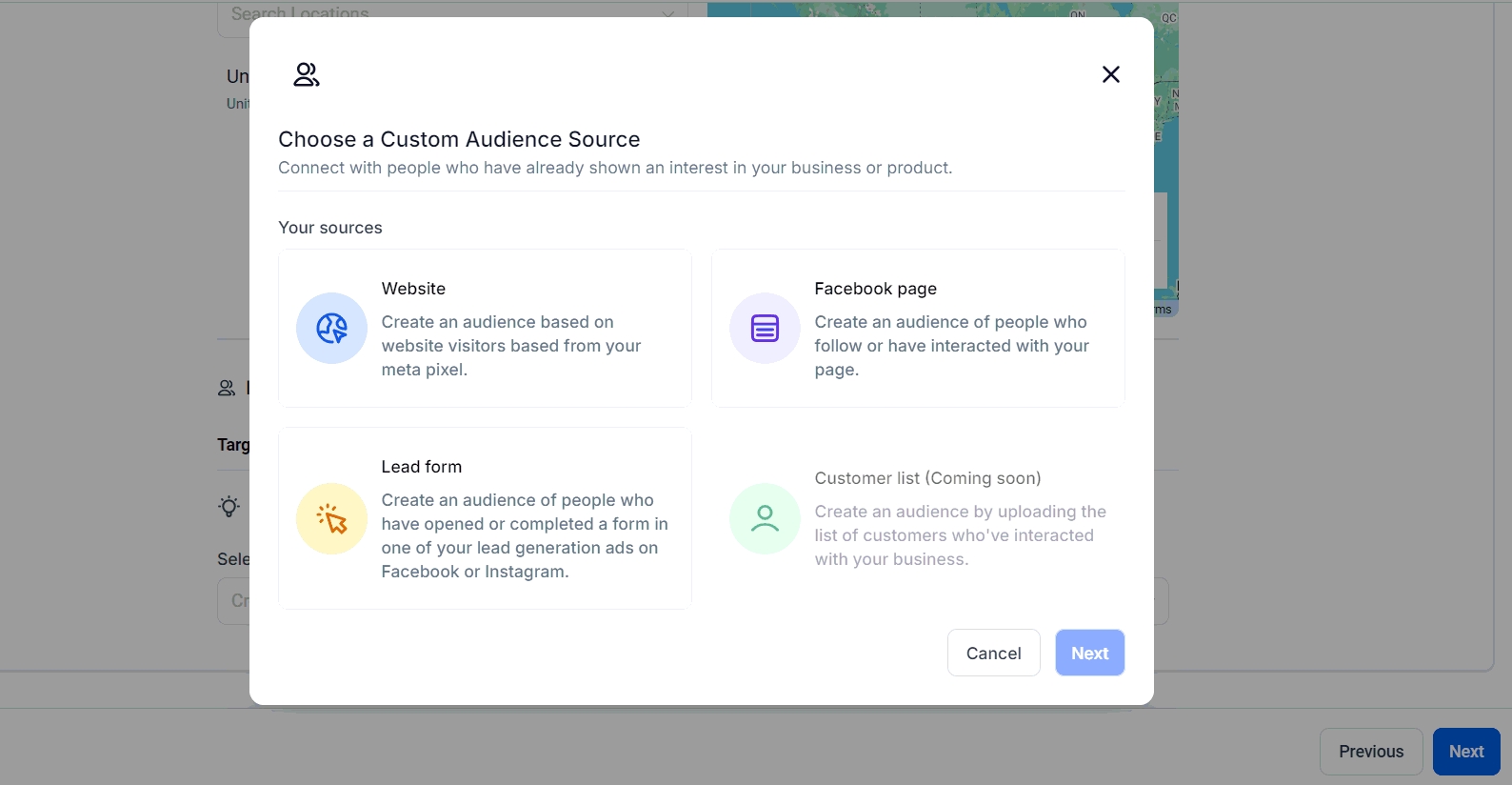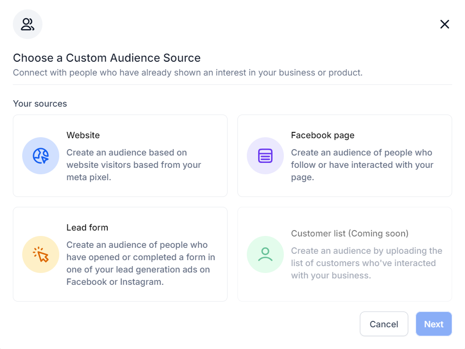 After selecting a source and clicking Next, you will configure the specifics of the custom audience based on the chosen source.