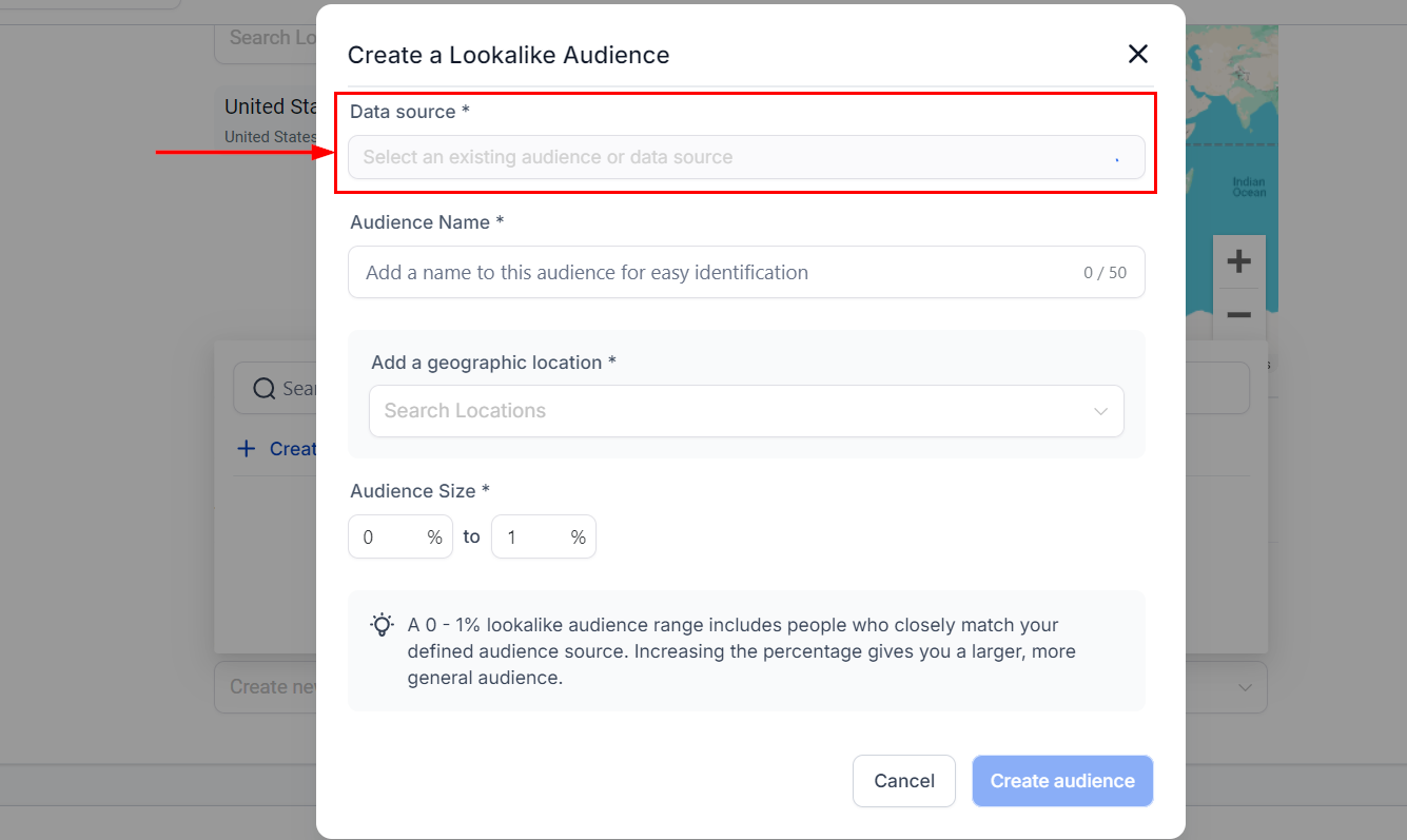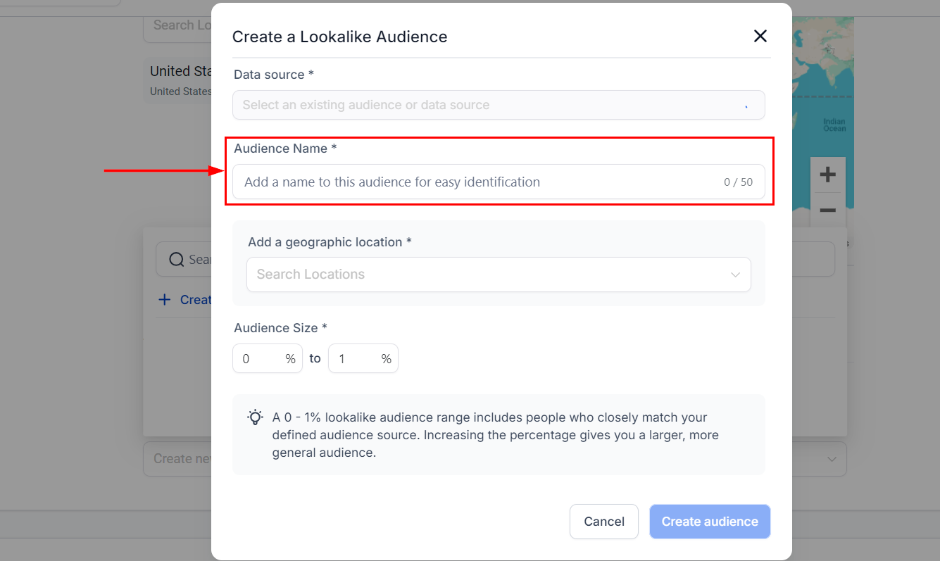After entering all the necessary details, click "Create Audience." The newly created Lookalike Audience will appear in the dropdown but may not be ready for immediate use.