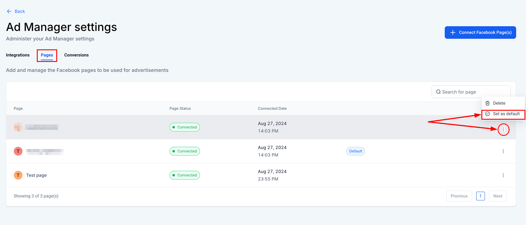 During the onboarding process, the first Facebook page connected to Ad Manager will automatically be set as the default.