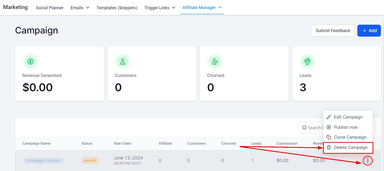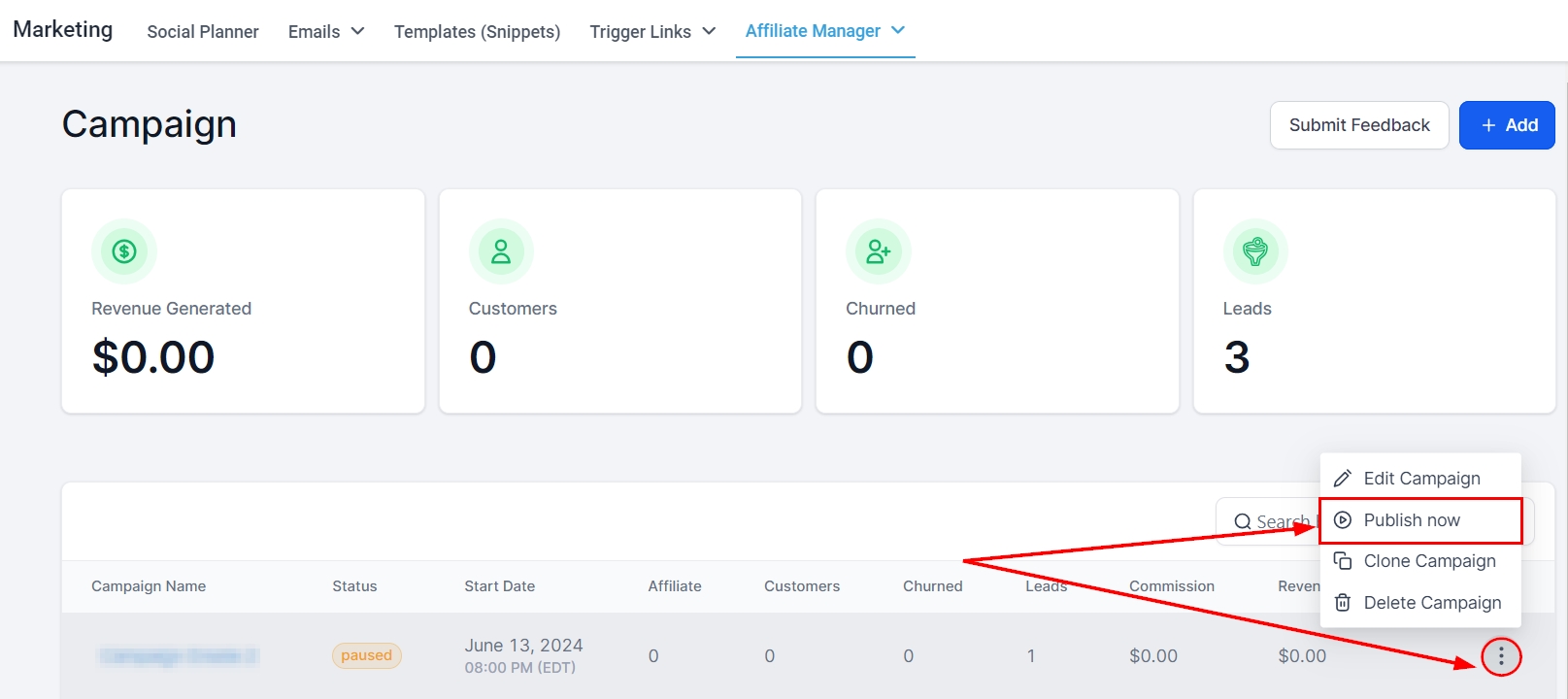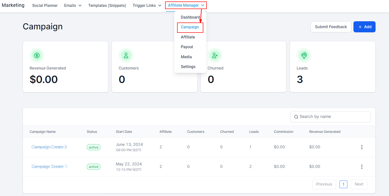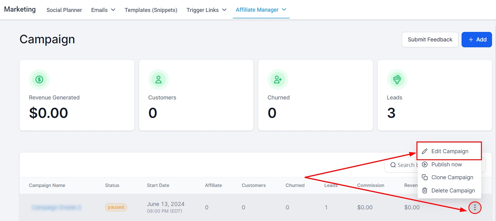 To create a new Affiliate Campaign, click on the '+Add' button. This directs you to the campaign editor's page.