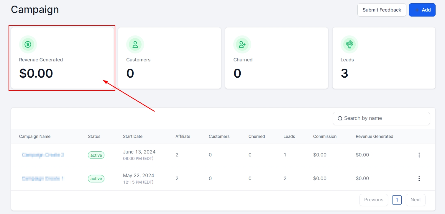 The Revenue Generated tab allows you to view the total revenue generated across all campaigns, giving you an insight into the overall performance of your campaign.
