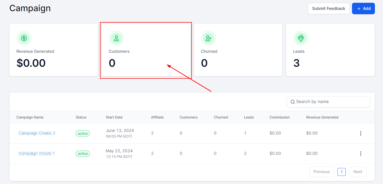 The Customers tab displays the number of customers invited through the links of your affiliates. This includes recurring or one-time-based customers.