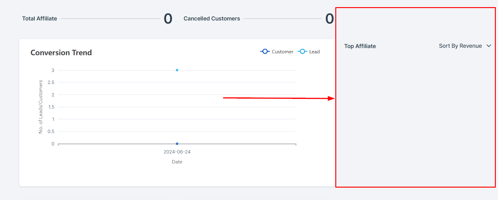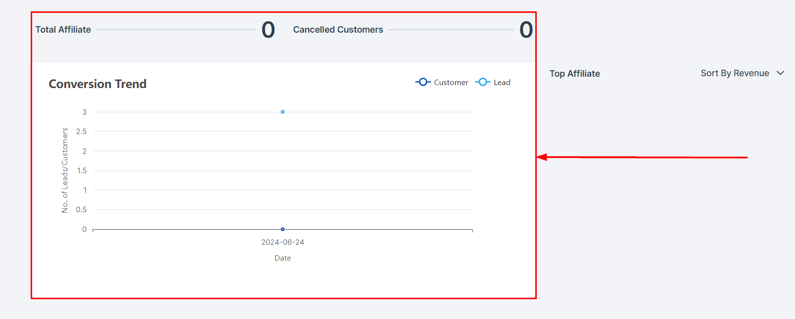 View your top 10 affiliates within this section. Filter affiliates based on revenue, commissions, leads, or customers.