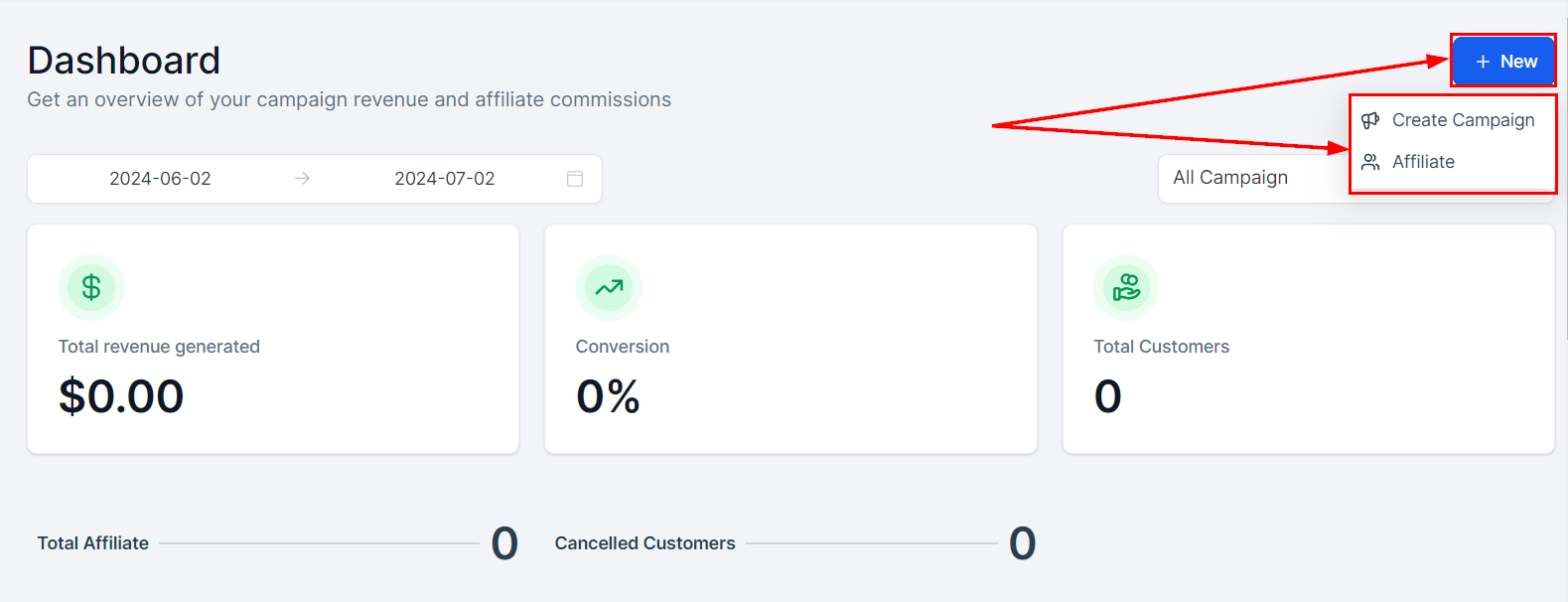 Click the New button to initiate the creation of campaigns or affiliates directly from the dashboard.