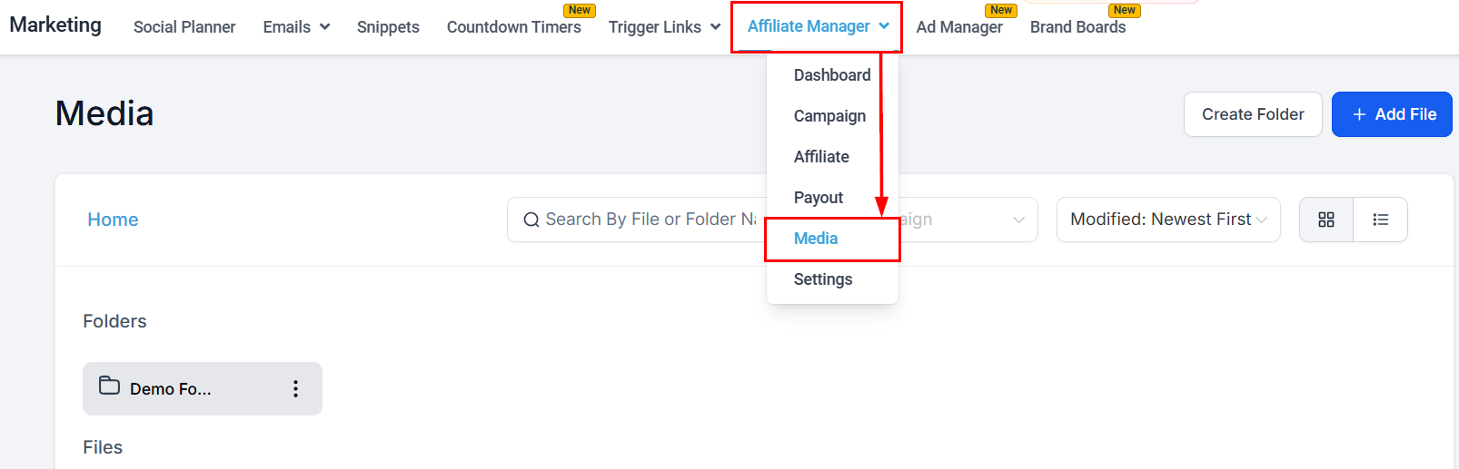 Navigate to the Affiliate Manager within Marketing and select Media from the dropdown menu.