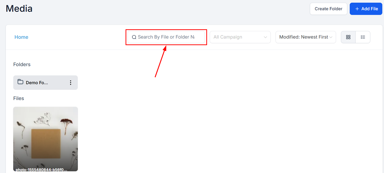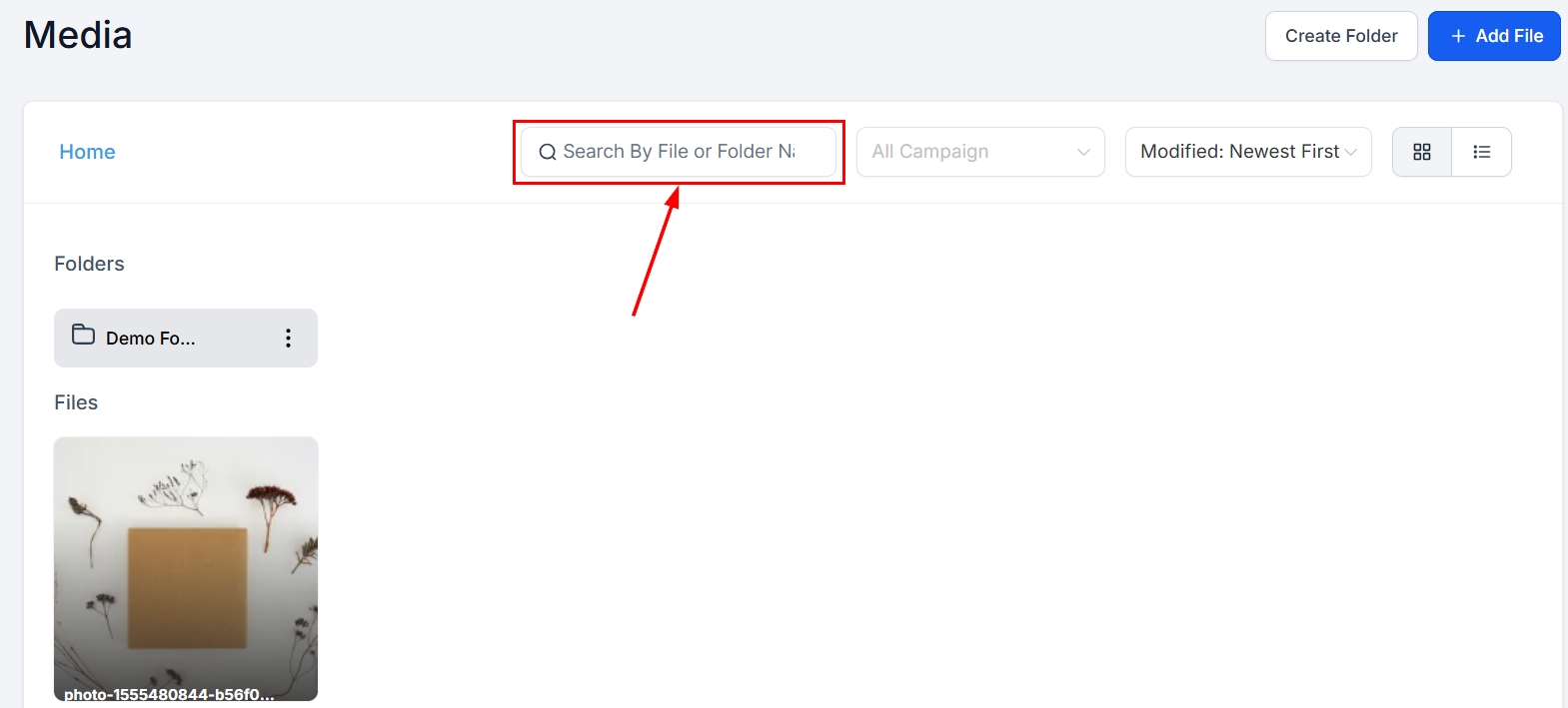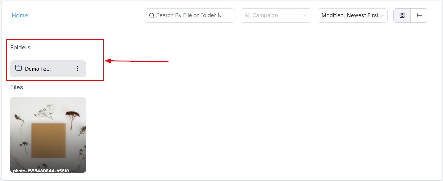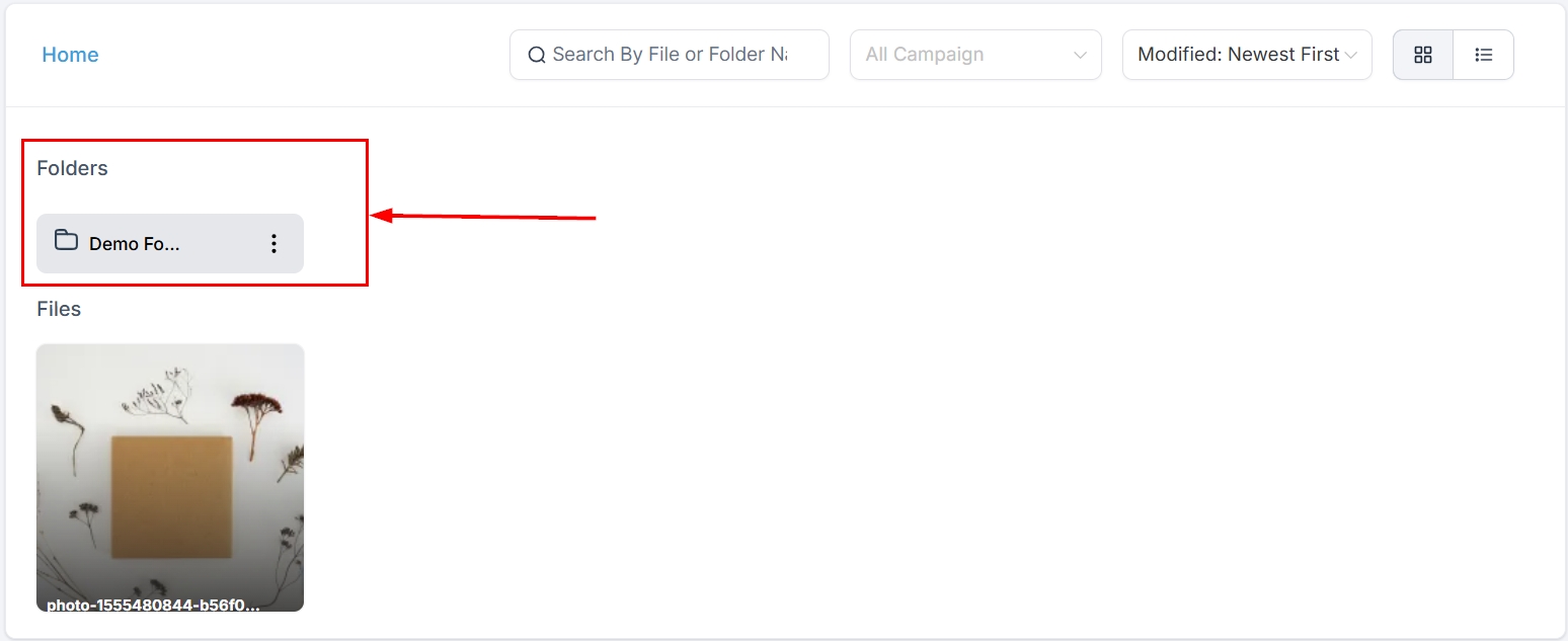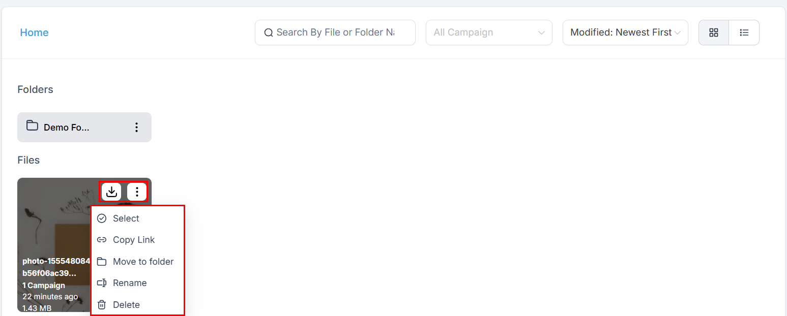 Within the Folders section, you will see all the folders that have been created to efficiently organize your files. Click the actions menu beside each folder to rename or delete it.