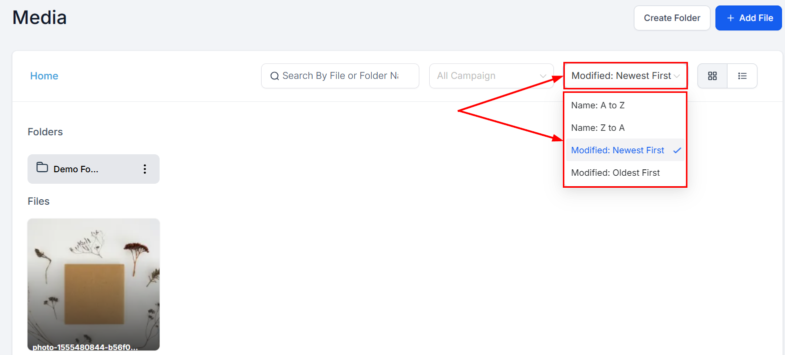 Sort media files and folders alphabetically, or by the date they were uploaded into the system.