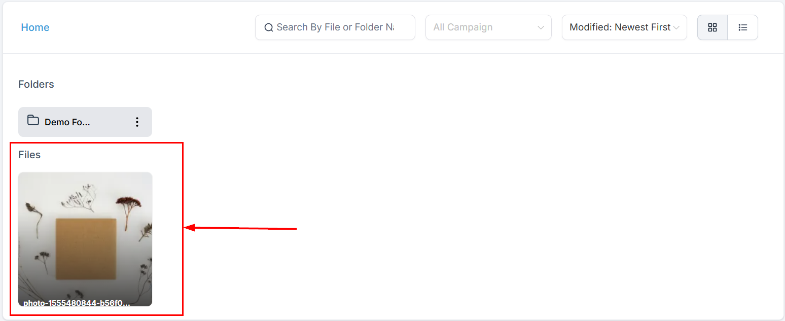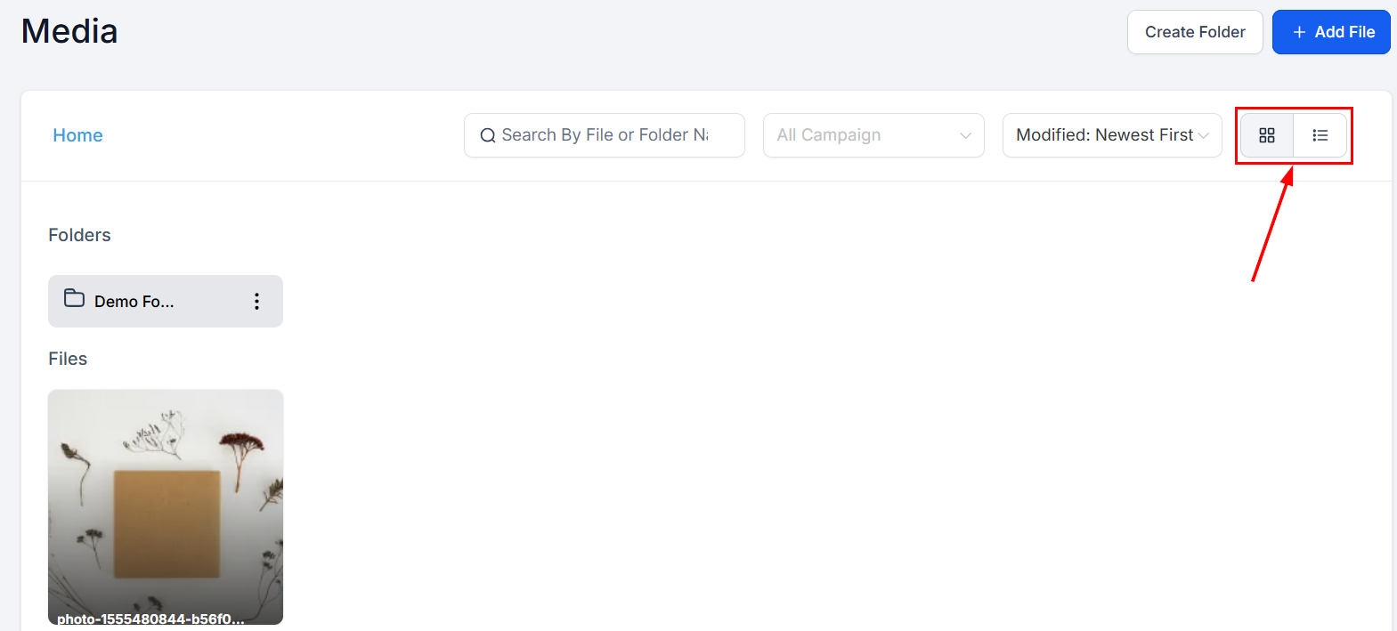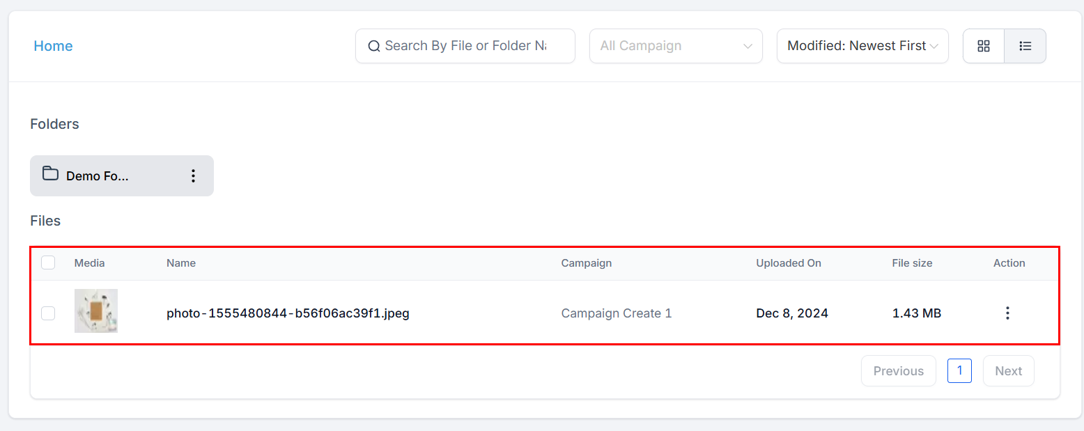 The List View offers detailed insights for each file, including its name, size, associated campaign, and upload date, providing a comprehensive overview of your media assets.