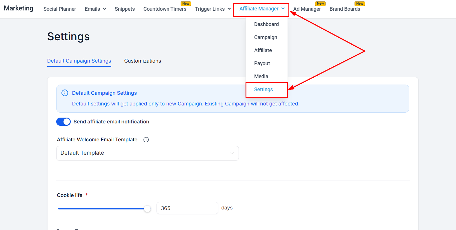 Click the Settings option within the Affiliate Manager dropdown to access this section.