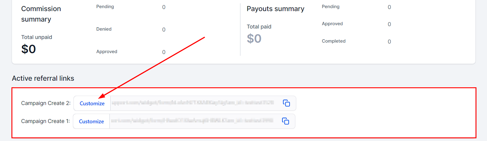 You will see the lists of all active referral links here. Press the Customize button to update the referral ID or add a coupon code.