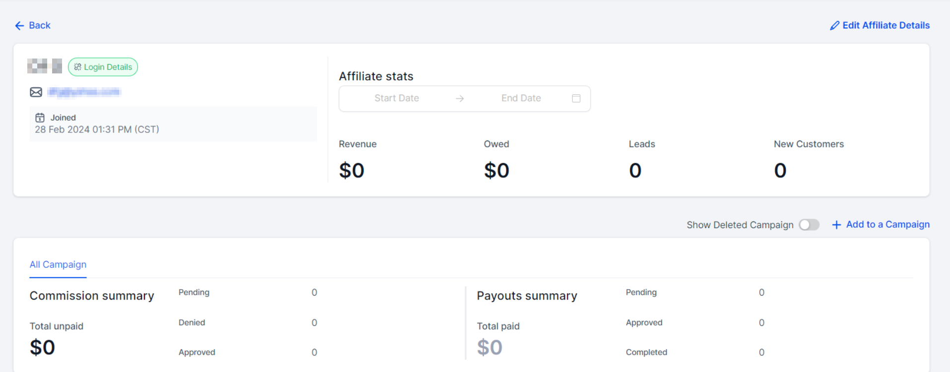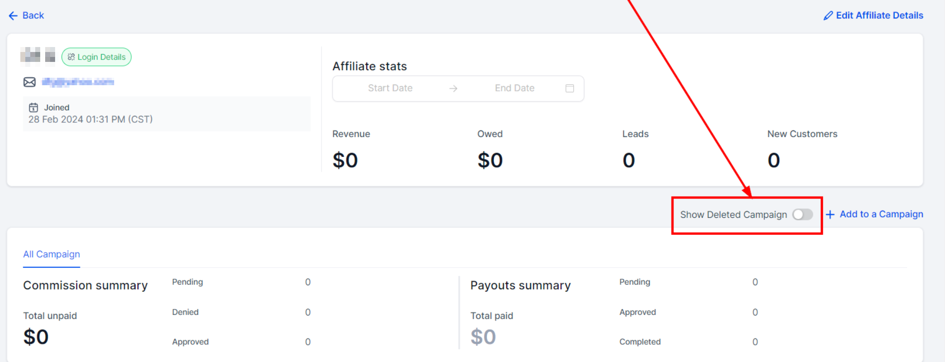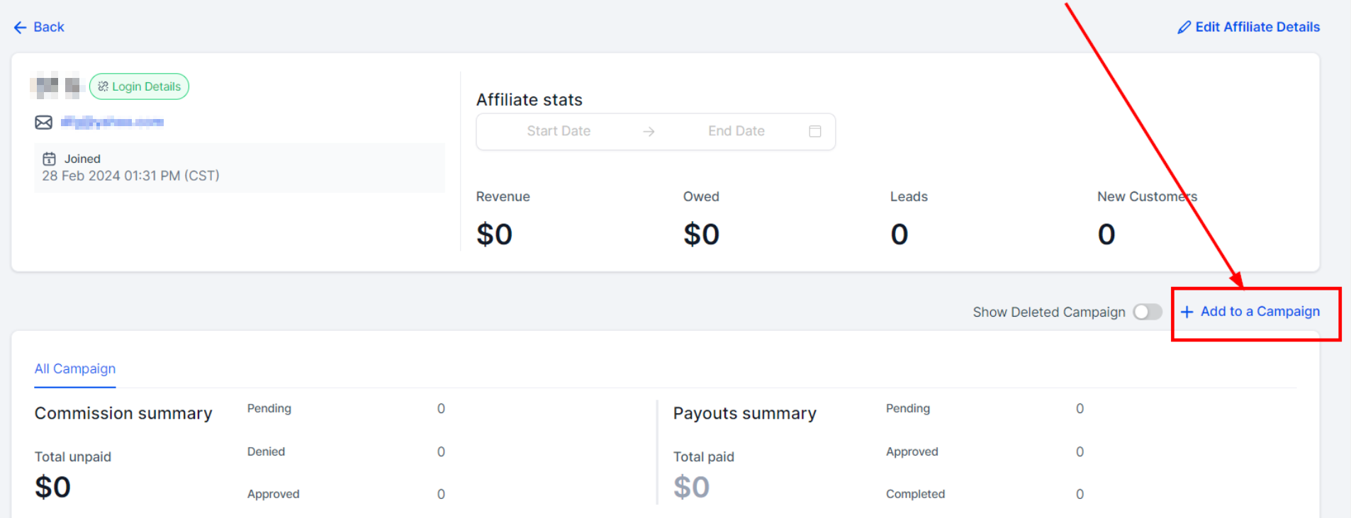 Click on the “Add to a Campaign" button to add an affiliate to a campaign.