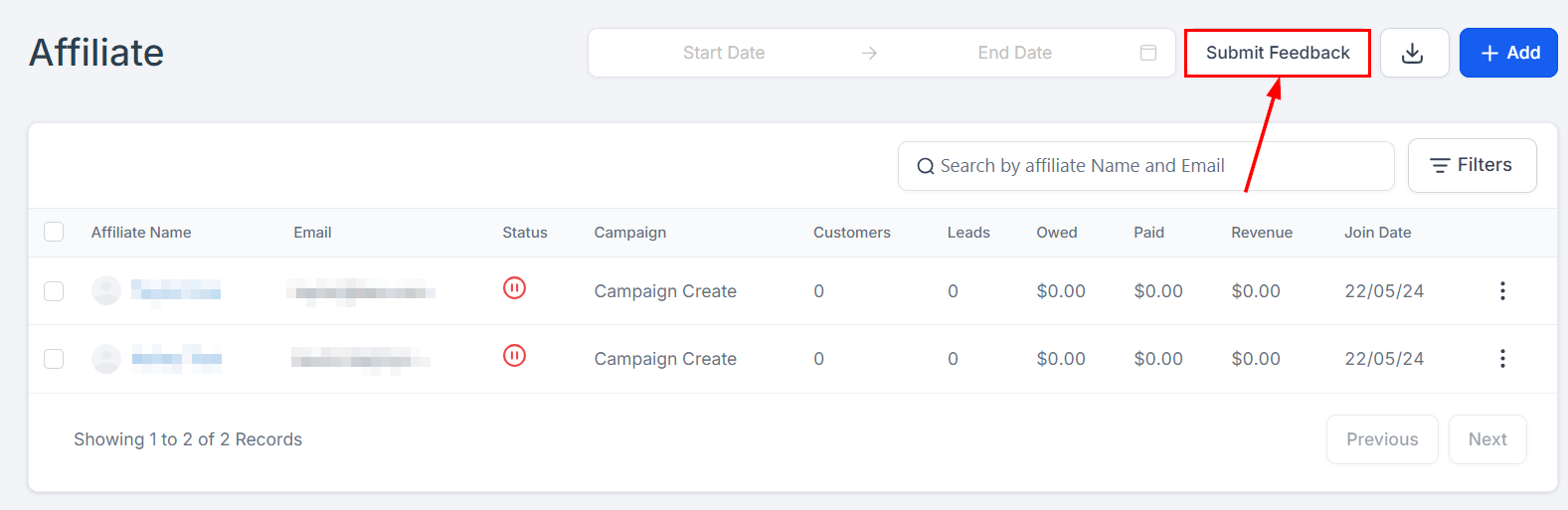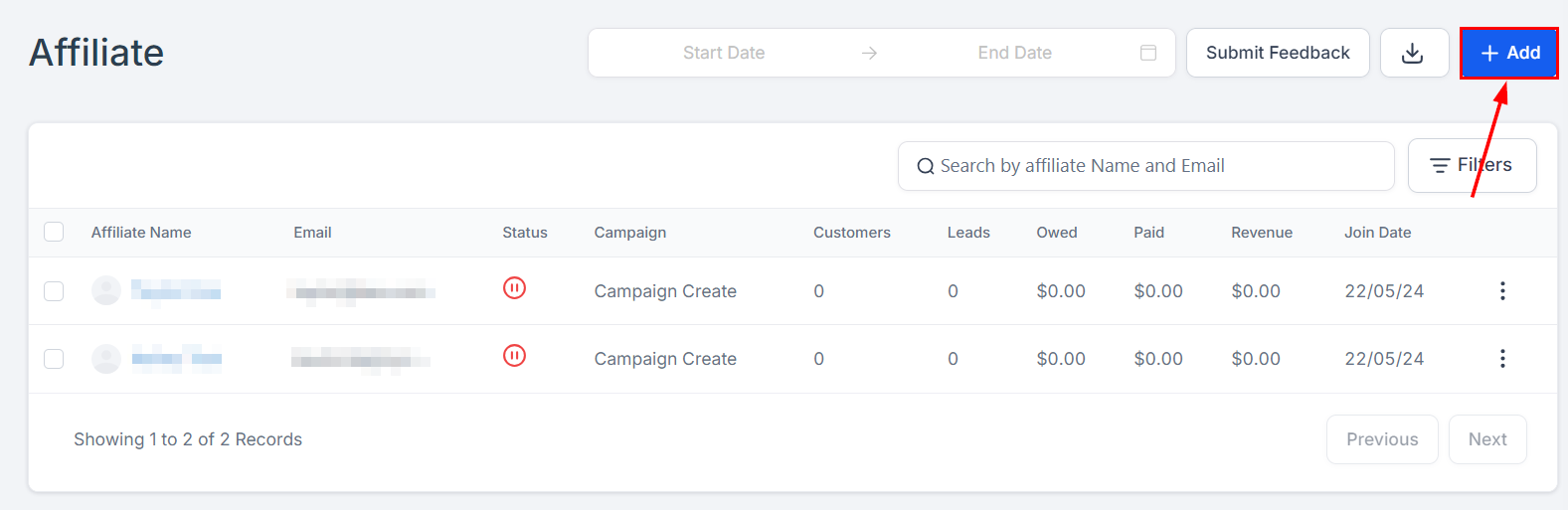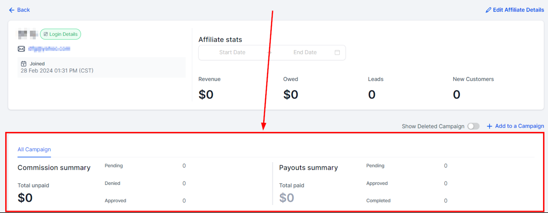 Click on the “Add to a Campaign" button to add an affiliate to a campaign.