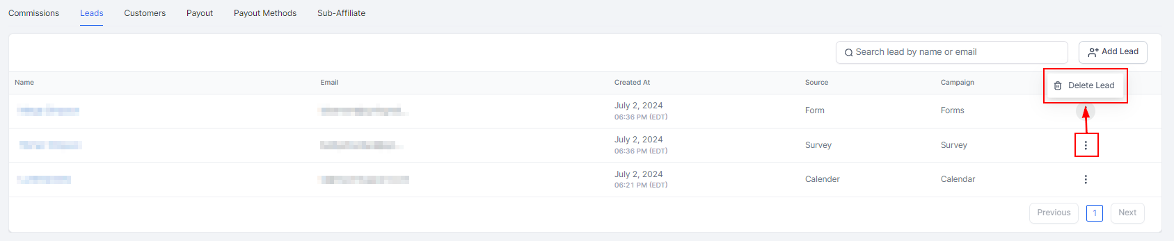 Search Bar: With the search bar, you can easily and quickly search for any lead or sub-affiliate name or email.