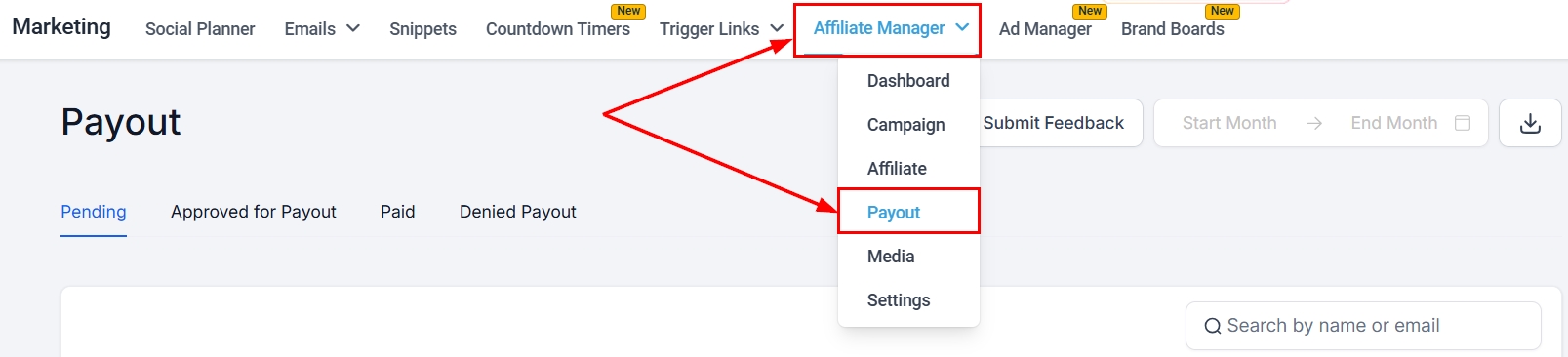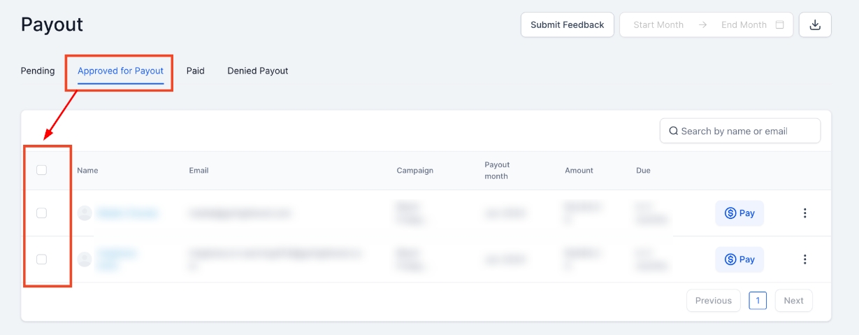 Select the Approved for Payout tab, here you can select the affiliates for payout by checking the box next to their name.