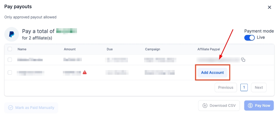 If you have not added a PayPal account for any of the affiliates click on Add Account to do it, once you add it click Pay Now to complete the action.