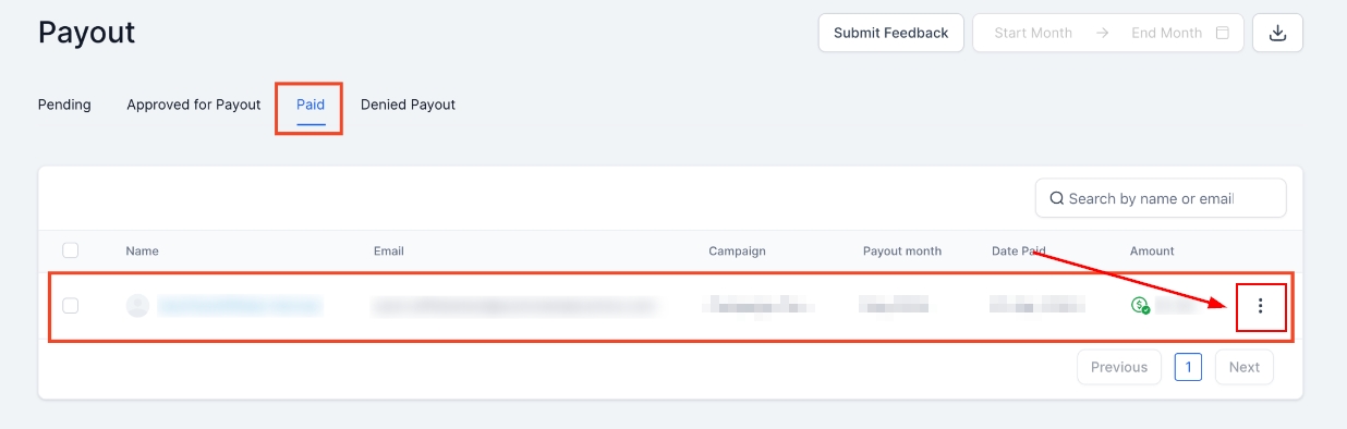 To finalize the payout the actions will vary depending if you're paying out to just one affiliate or several at the time. For individual payout click the $Pay button.