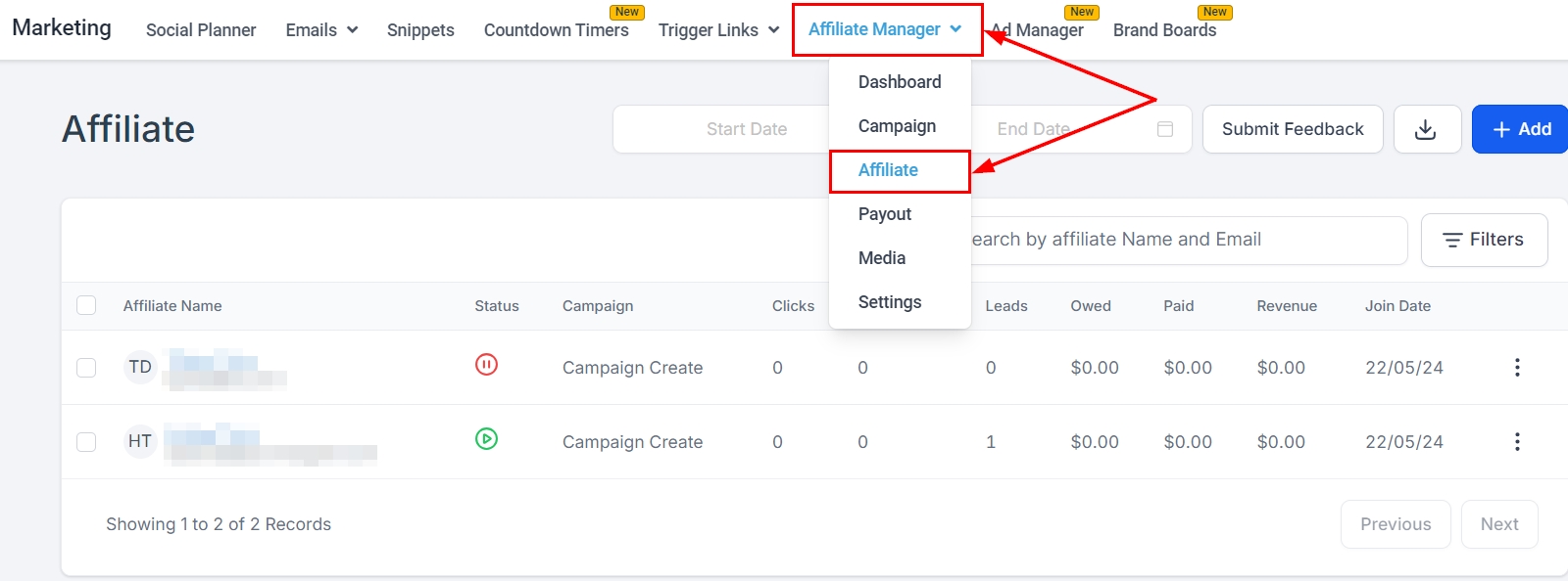 Start by navigating to the affiliate page. This can be found under the 'Affiliate Manager' section within the 'Marketing' tab of your CRM dashboard.