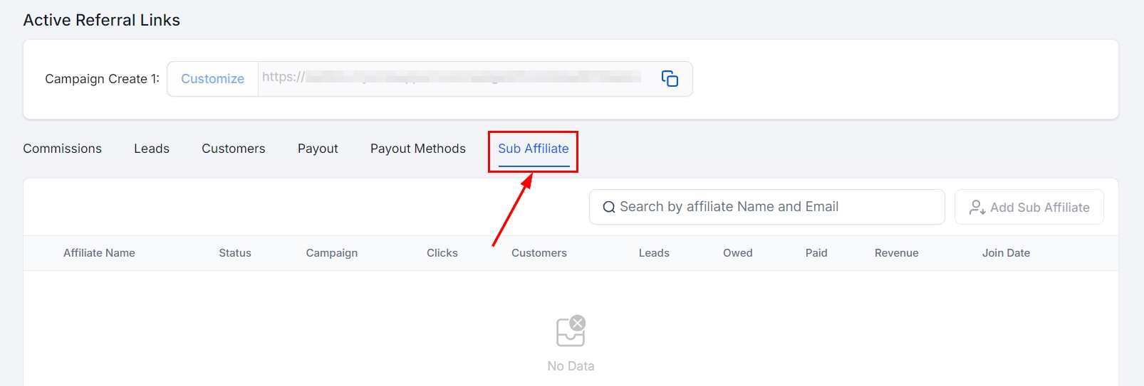 Scroll down to the bottom of the page until you find the Sub-Affiliate tab. Click on it to view a list of all sub-affiliates already added under this parent affiliate.