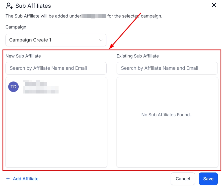 You will see two lists in the pop-up. The first list allows you to pick affiliates already present in the system. The second list shows existing sub-affiliates under this parent affiliate. You can search by name or email and click on the profile to add it.