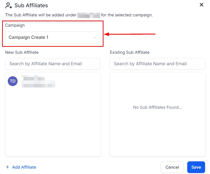 The first step in the pop-up is to choose the campaign for which you want to add the sub-affiliate. By default, it selects the first campaign the parent affiliate was added to.