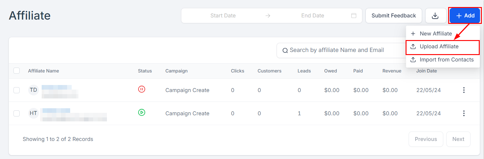 Affiliates can also be added in bulk by uploading a CSV file containing their information. To upload a bulk list, click the Add button, then select Upload Affiliate.