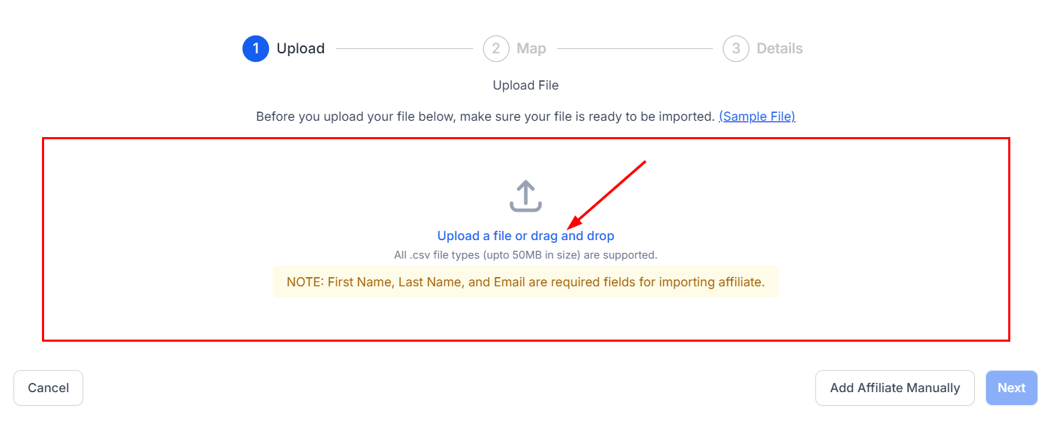 Ensure your file is in CSV format and includes the following fields: First Name, Last Name, and Email. The maximum file size is 50MB. A sample document is available for reference.