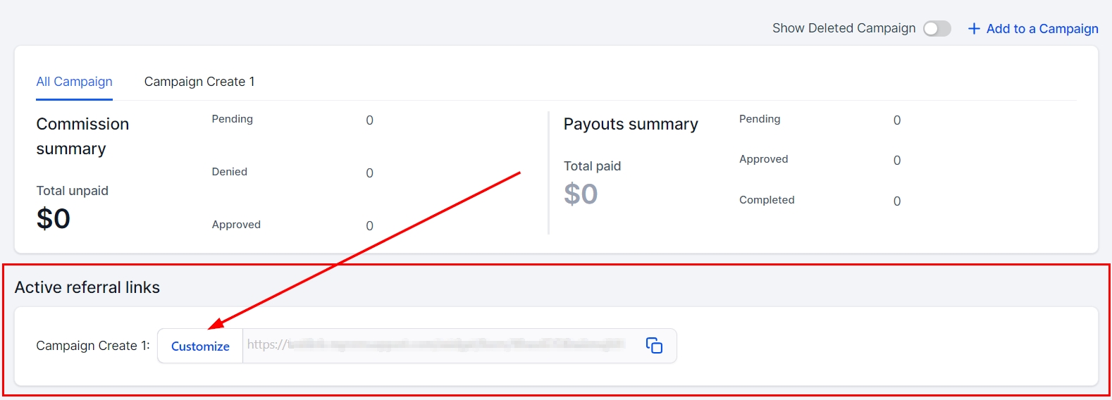 Scroll to the active referral links section within their profile. Here, you will see the list of campaigns the affiliate has been added to as well as the affiliate's URL. Click the “Customize” button beside the campaign you wish to associate the coupon with.