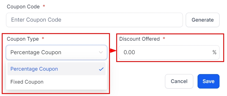 Create a custom coupon code or let the system generate one automatically. If you prefer a specific code, simply type it into the provided field. Alternatively, clicking the "Generate" button will produce a randomized coupon code, ensuring uniqueness without the need for manual input.