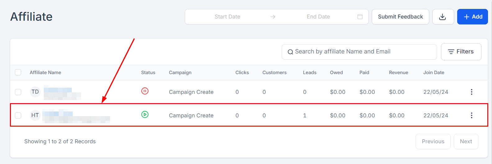 Select the name of the affiliate you wish to add the coupon to from the Affiliate Page.