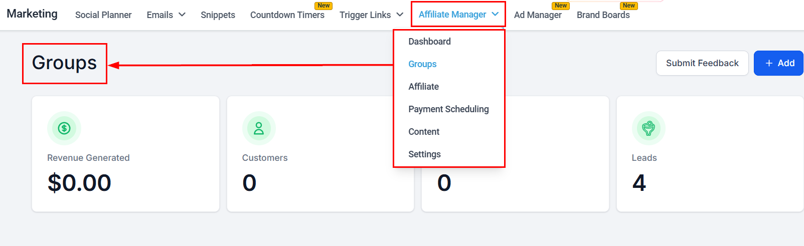 From your account dashboard, head to the Marketing tab and click on the Settings option within the Affiliate Manager dropdown. Within the Affiliate Manager settings, find the "Customizations" menu. This is where you will be able to make your label adjustments.