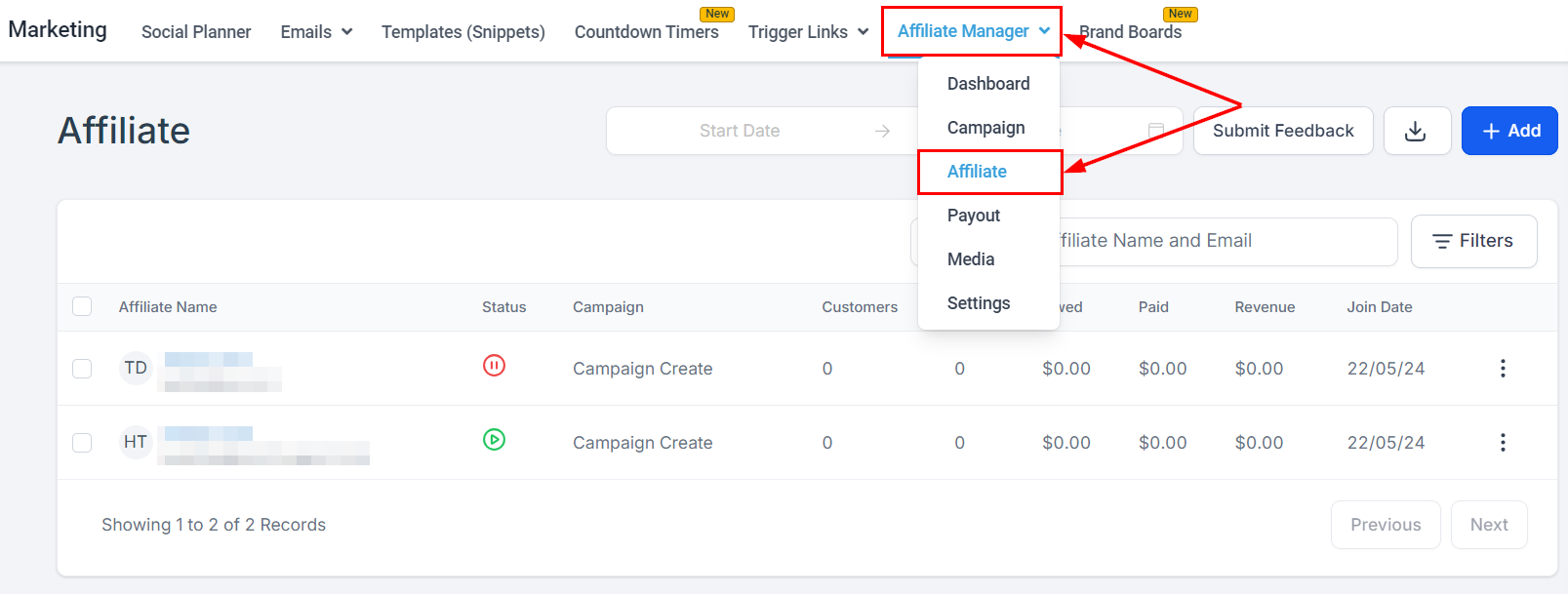 From the left navigation menu, access the marketing tab. Then, select "Affiliate Manager" > "Affiliate" from the top navigation menu.