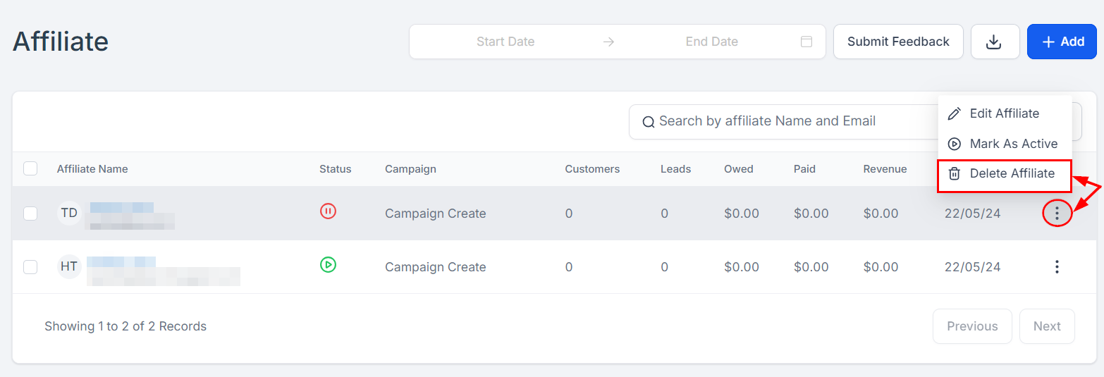In the Affiliate section, you will see a list of all affiliates. Scroll through the list or use the search function to locate the specific affiliate you want to remove. Once found, click on the three vertical dots located next to their profile. From the drop-down options, select Delete to proceed with removing the affiliate from your system.