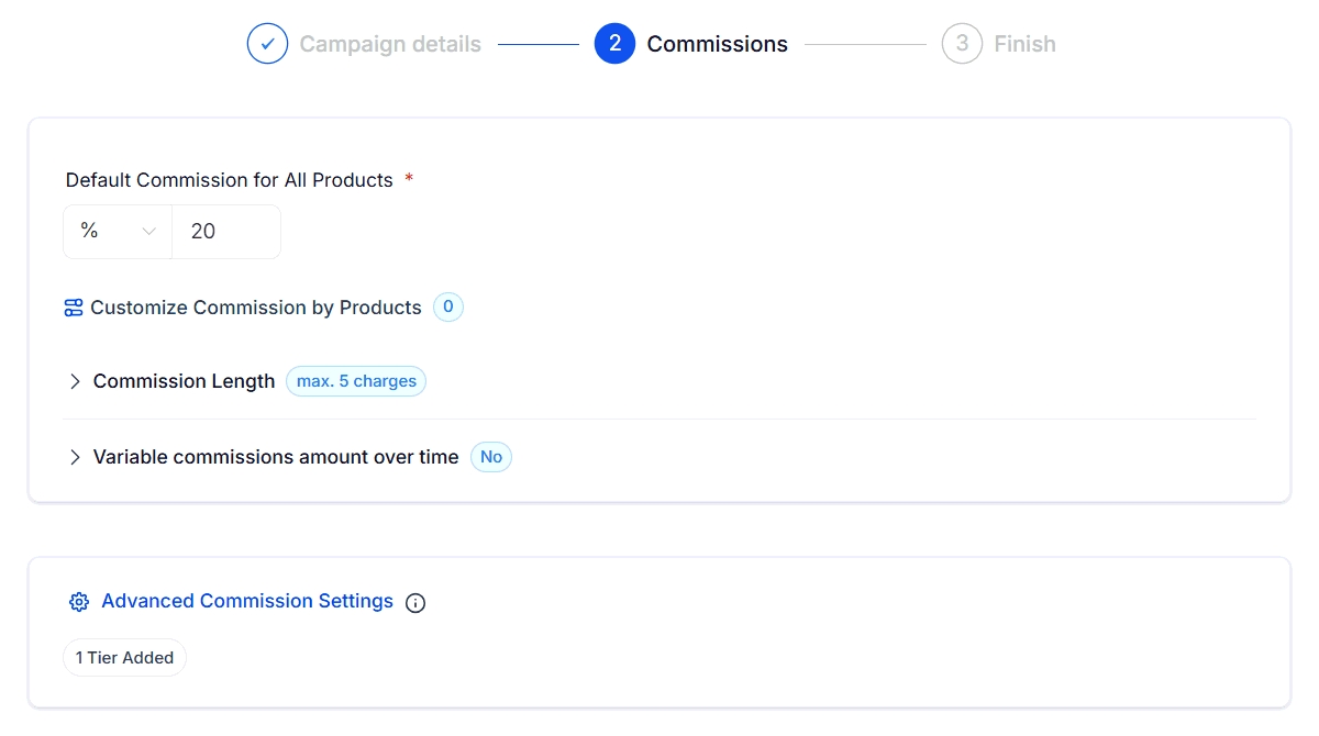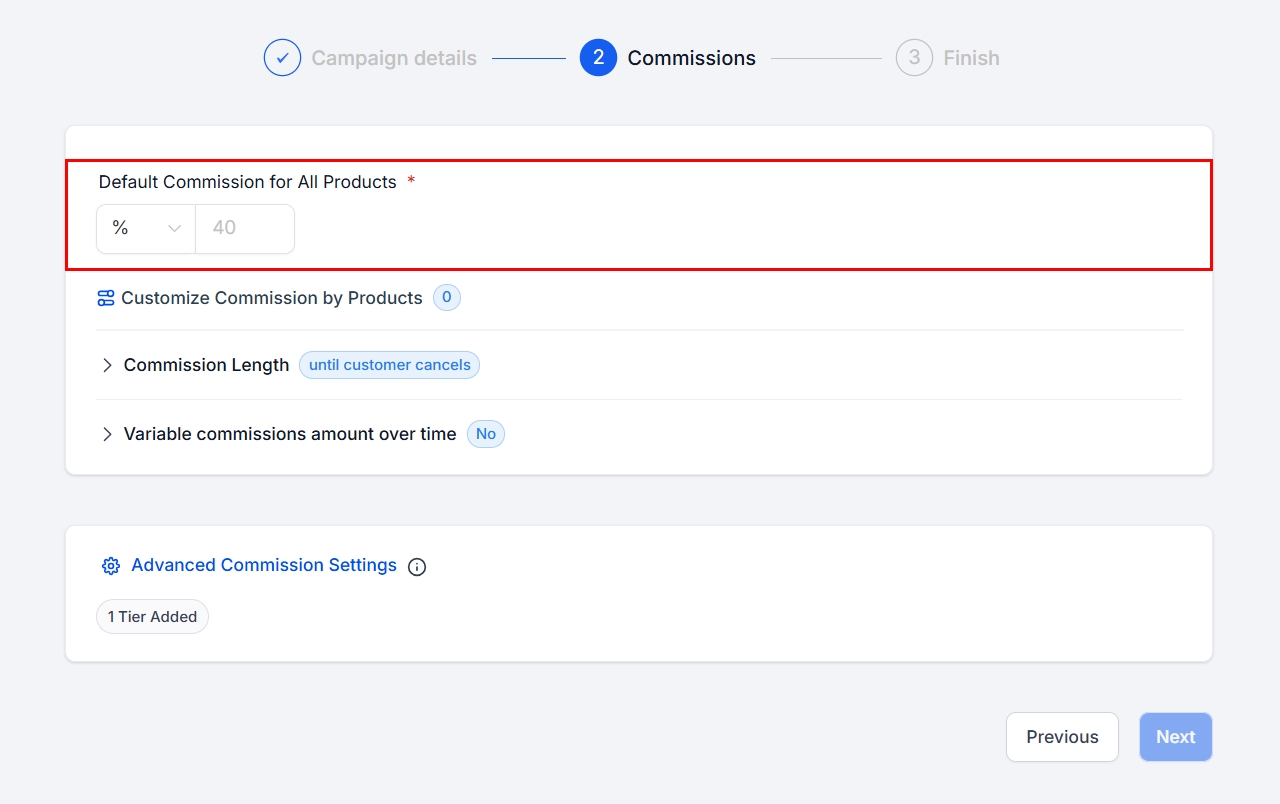 In Step 2 of the campaign setup, define the default commission rate affiliates will earn by default.