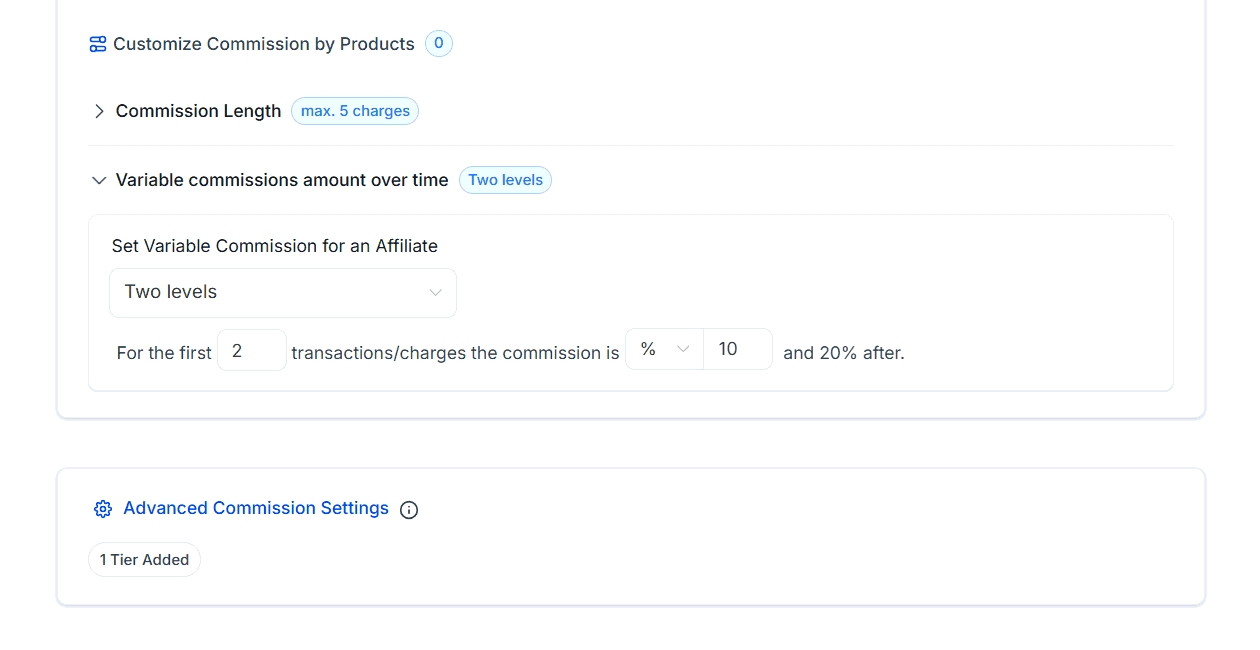 The Commission Length and Variable Commissions Over Time features provide greater flexibility in managing affiliate rewards for recurring product sales. These features allow you to define how long commissions are paid and customize rates based on specific charge counts, enabling more strategic and scalable affiliate programs.