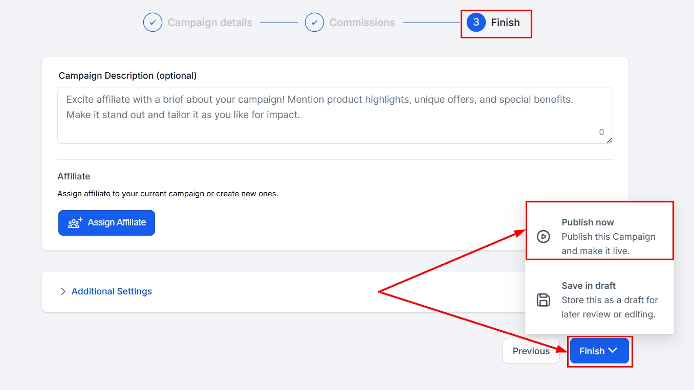 Save your campaign as a draft, or publish the campaign to apply the updated commission settings.