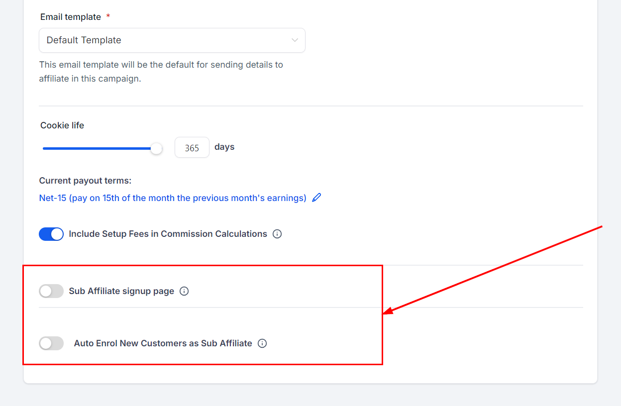 For Campaigns with multiple affiliate tiers, you can configure the option to enable sub-affiliate signup forms. Additionally, you may choose to automatically enroll new customers as sub-affiliates. When enabled, new customers will be automatically registered as sub-affiliates under the affiliate who referred them.