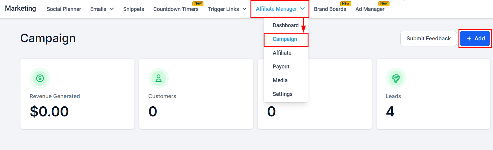 To initiate the campaign creation process, click the "+Add" button located in the upper right-hand corner of the Affiliate Campaign screen.