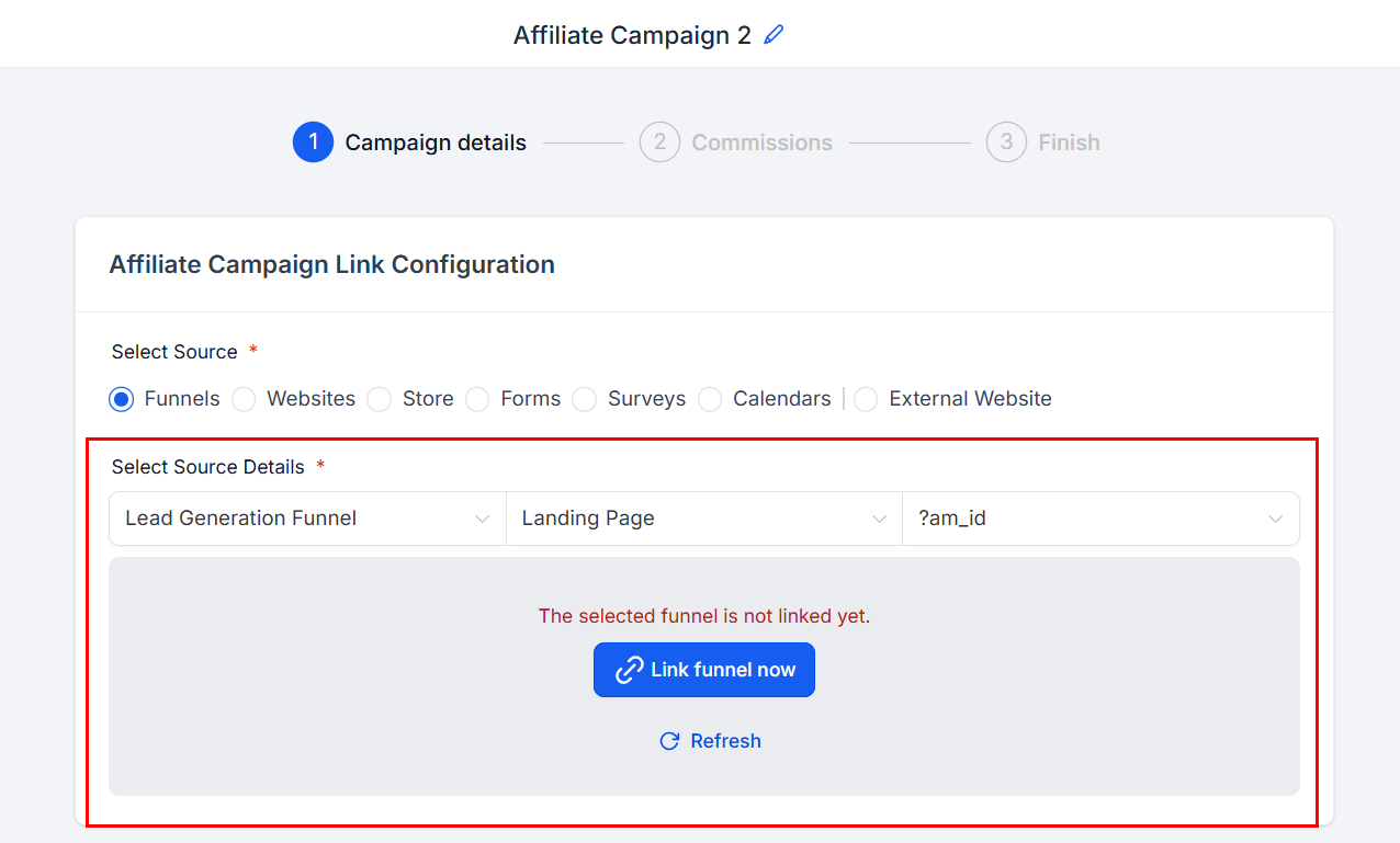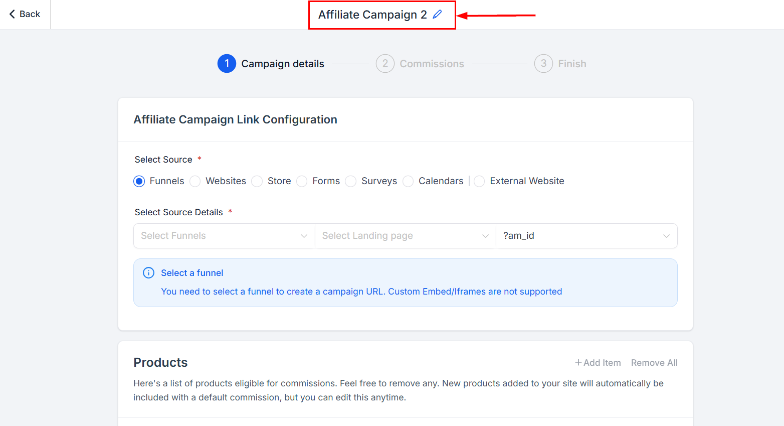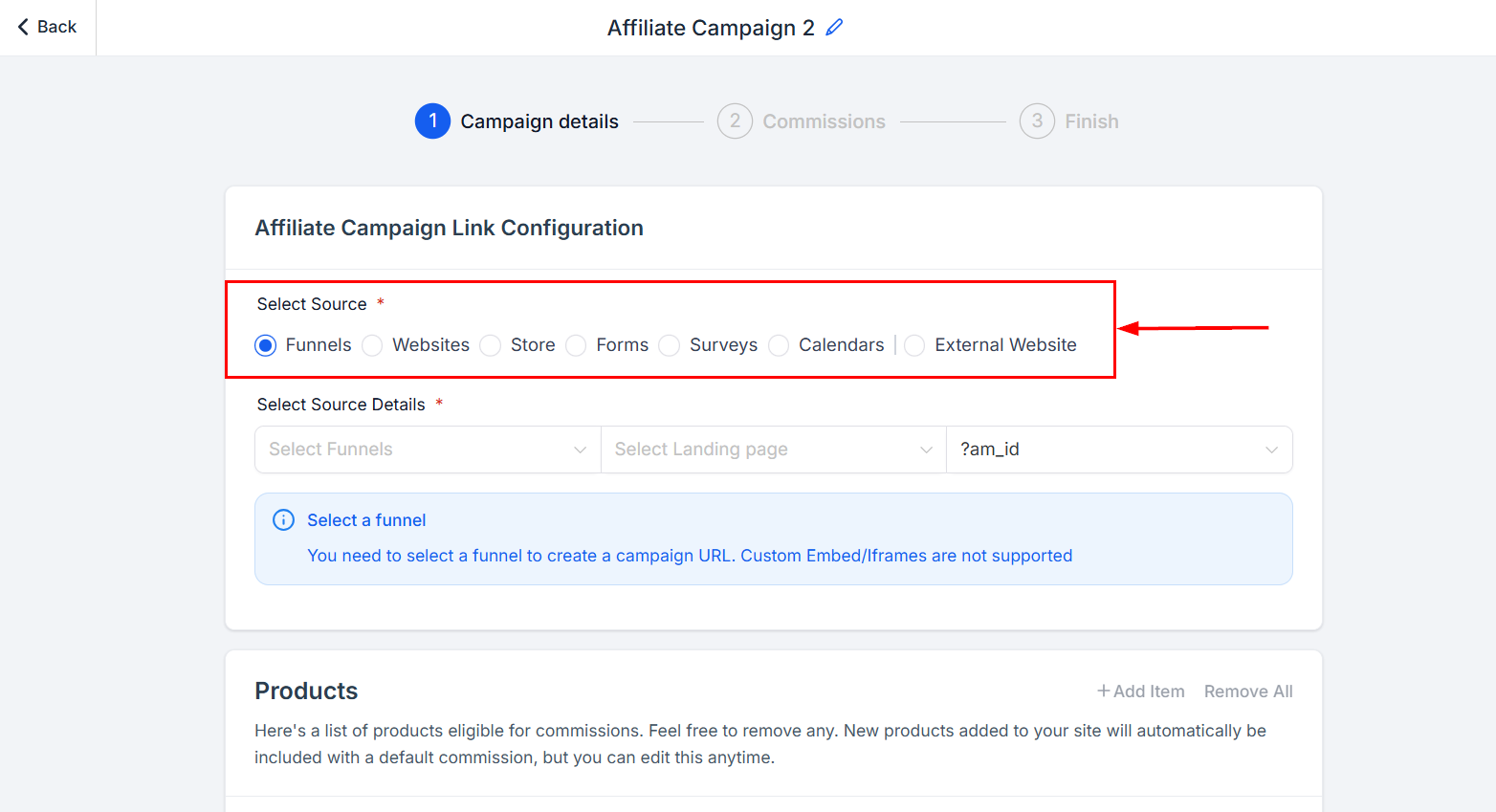 For affiliate campaigns with a funnel, website, or store as its source, choose the products on which an affiliate commission is applicable. The affiliate campaign can only be activated once the respective products have been selected. You will not be able to publish a campaign until these requirements are met; however, you can save an affiliate campaign at any time and return later to add products or services.