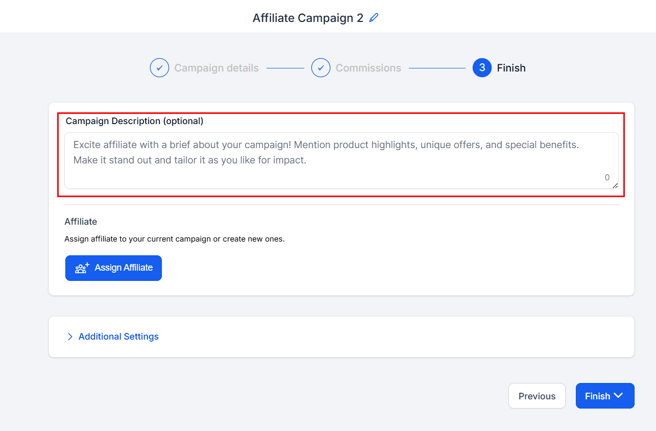 In this space, you can provide a concise overview of the campaign's main objectives and elements. This description will help convey the essence of the campaign and allow others to quickly grasp its purpose and goals, ensuring clarity and effective communication.