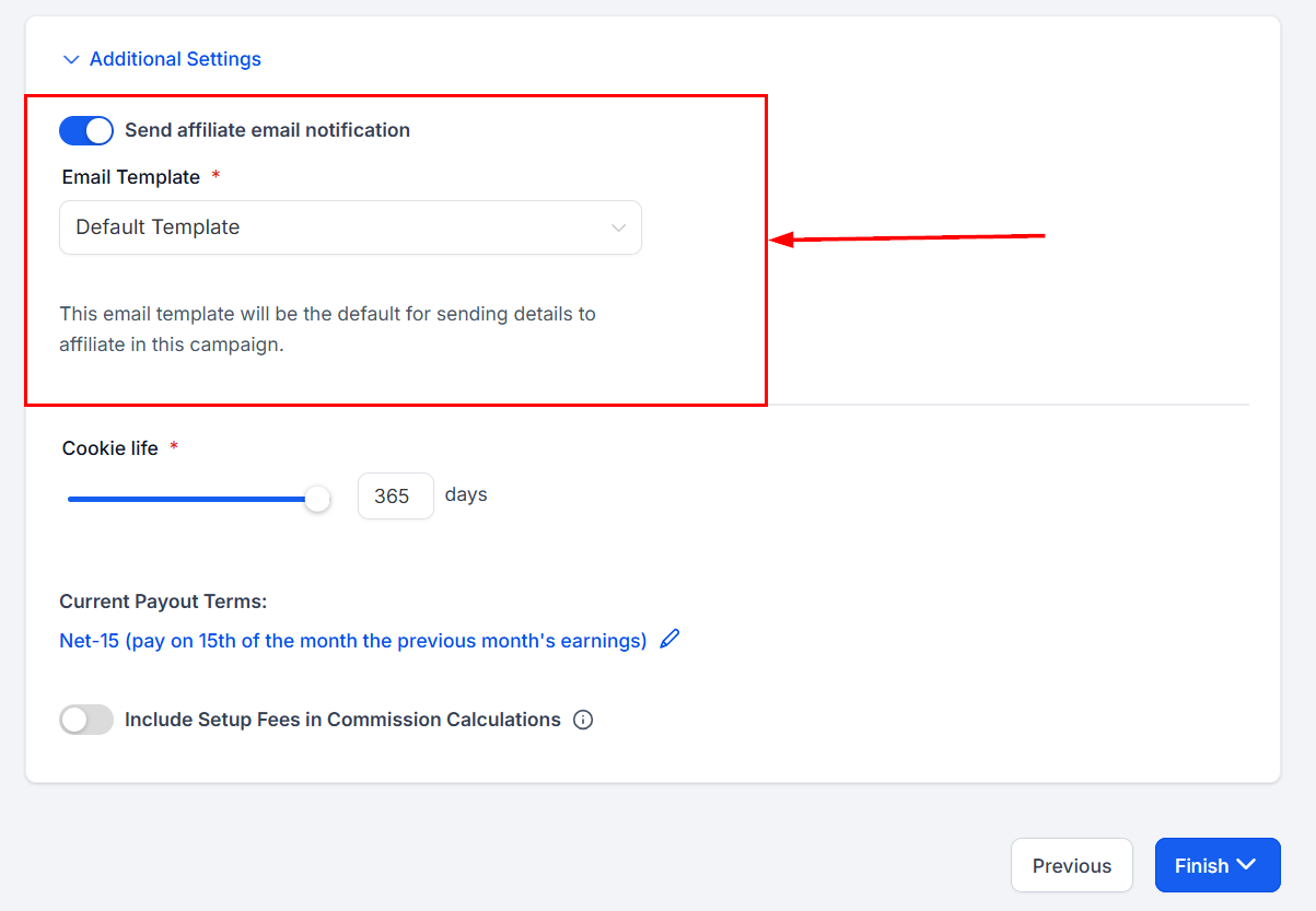 Choose whether to send an email to the affiliates added to the campaign. The available email templates for onboarding new affiliates will appear in the template dropdown.