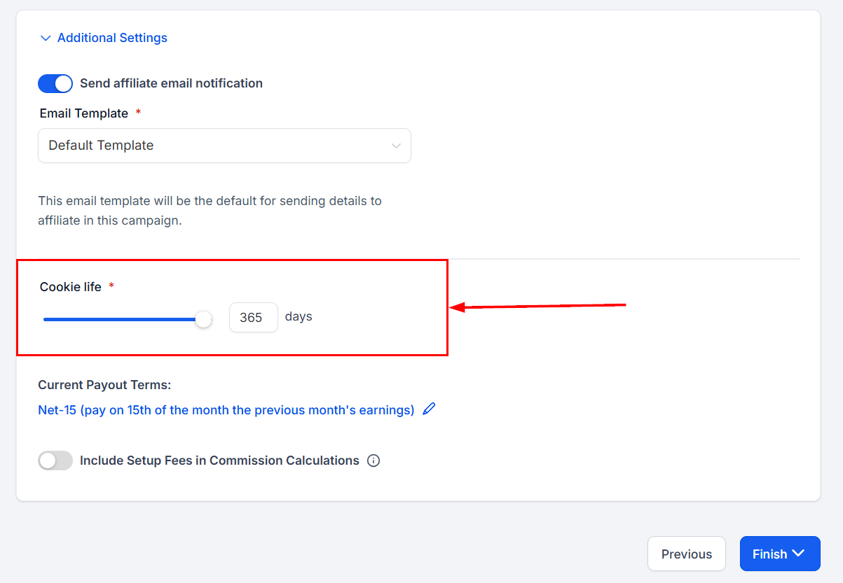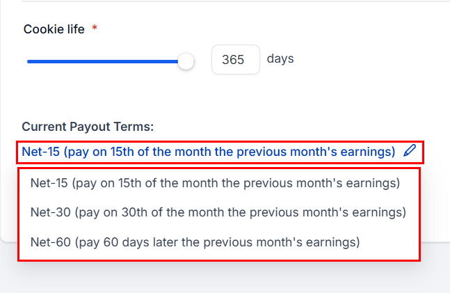 The pay-out terms option enables you to determine the specific time intervals at which payments will be issued to affiliates for each sale they generate. This customizable feature allows for better management of cash flow and ensures that affiliates are compensated according to your preferred schedule, fostering a healthy and productive partnership.