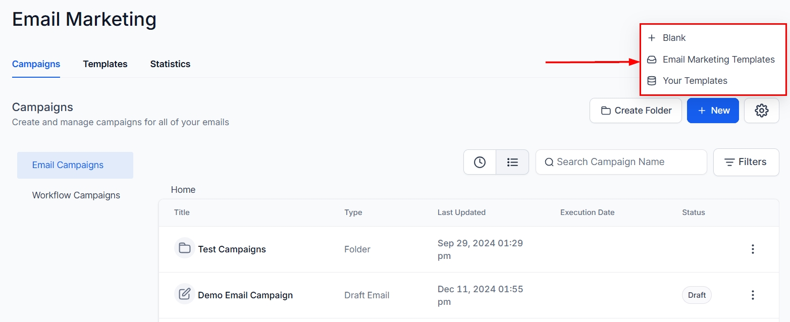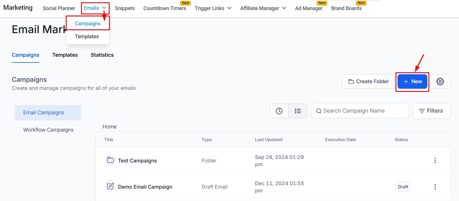 To begin setting up an A/B test email campaign, head to Campaigns in the Emails section within Marketing, select a drafted campaign from the list, or click the +New button in the upper right-hand corner to create a new campaign.