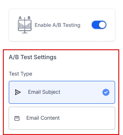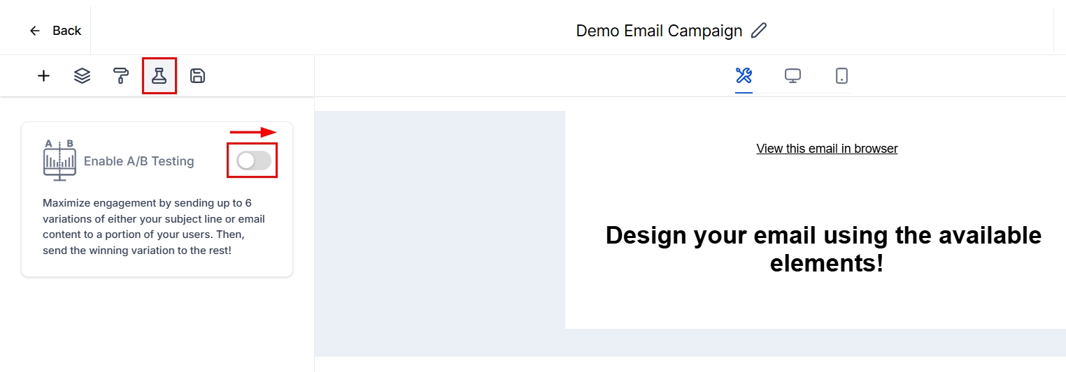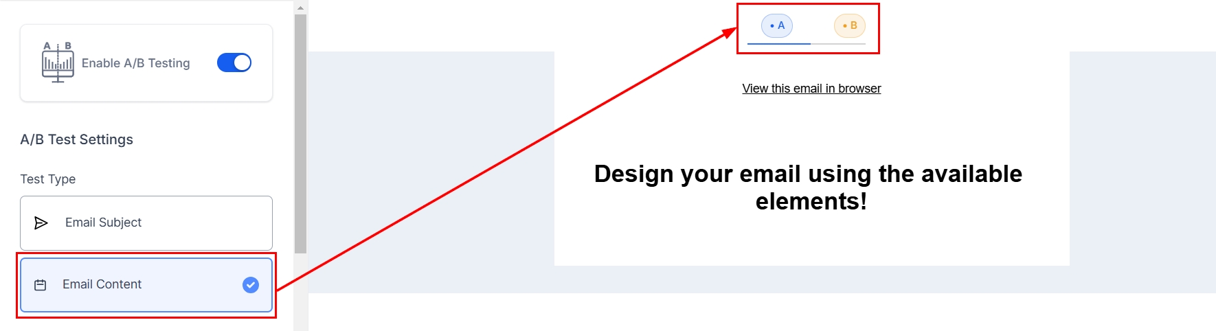 Once you are satisfied with the content and design of your email, go to the A/B Testing tab and toggle the switch to enable the feature.