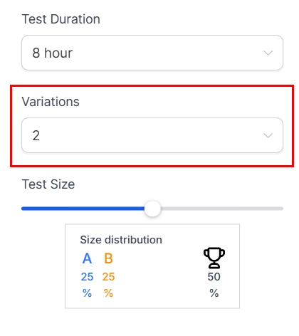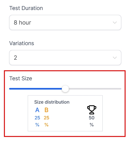 Use the slider to determine the percentage of contacts that will receive the different variations and view the size distribution below. In this example, Variations A and B will be sent equally to half of the contacts (25% each), then the winning variation will be sent to the remaining 50%.