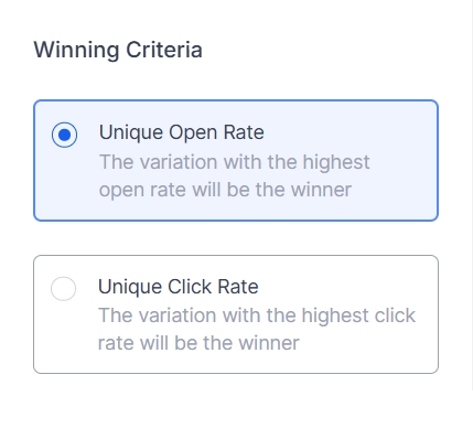 Choose the metric you will use to decide which version of the email is the winner. You can pick either "Unique Open Rate" or "Unique Click Rate."
