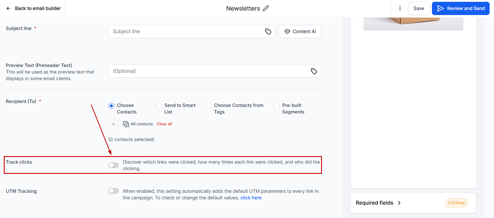 Before sending the email, enable click tracking by toggling the switch.